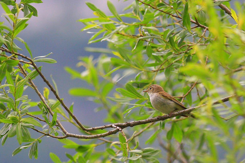 This bird does not reveal a lot of identificational clues due to the angle of the bird but does however show a warmer tone to the head and a long whitish and welldefined supercilium indicating Western Bonelli's Warbler.