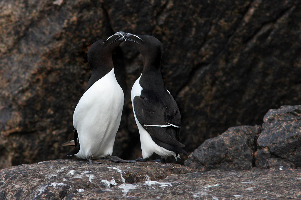 Beskrivelse: Efterhånden yngler der mellem 50 og 100 par alke på klippekysten omkring Hammeren. Billedet taget fra en gyngende jolle.