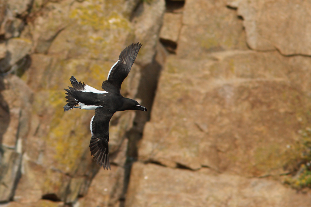 Beskrivelse: Efterhånden yngler der mellem 50 og 100 par alke på klippekysten omkring Hammeren. Billedet taget fra en gyngende jolle.