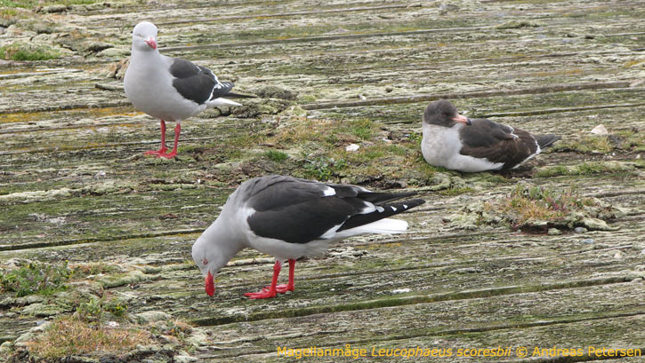 Säregen och vacker är den, Magellanmågen eller Dolphin Gull. Den yngre till höger förmodligen en 2k fågel att dömma av mörkt öga kvarhållna juv vingtäckare kontrasterande mot gråsvart ovansida (ungefär som fuscus intermedius)samt ej så svullen näbbspets.
