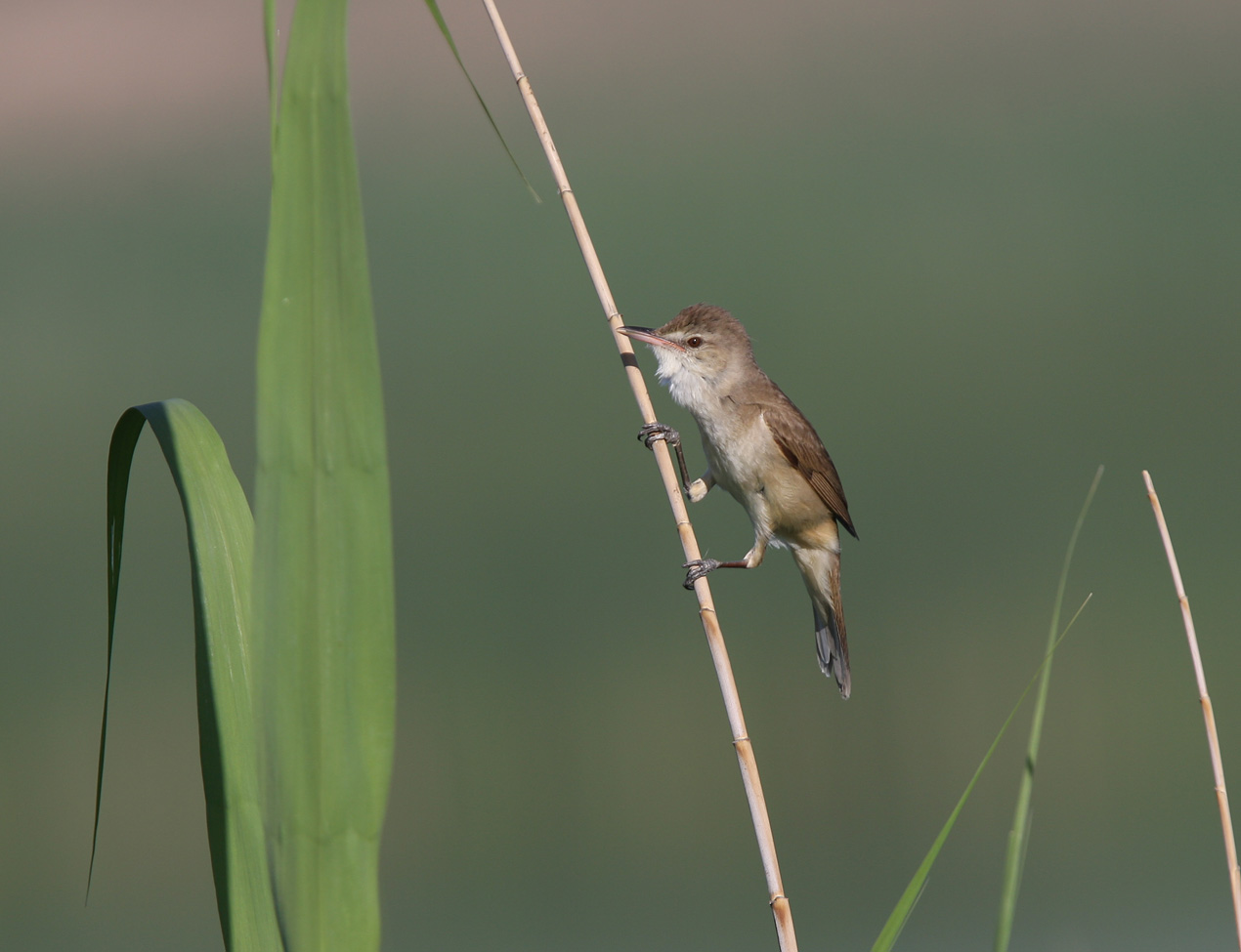Beskrivelse: Clamorous Reed Warbler ssp brunnescens is sometimes referred to as Indian Reed Warbler Acrocephalus brunnenscens, e.g. Rasmussen, P.C. & Anderton, J.C. Birds of South Asia. The Ripley Guide. Vols. 1 and 2. Smithsonian Institution and Lynx Edicions, Washington, D.C. and Barcelona. BUT usually treated as conspecific with Clamorous Reed Warbler A. stentoreus. Field characters in fresh or slightly worn plumage which separates it from Great Reed Warbler Acrocephalus arundinaceus: Finer, decurved-looking bill than nominate G.R.W. with dark distal lower mandible - G.R.W. has more heavy and thicker bill. In fresh plumage pale throat contrasting unstreaked darker breast. In addition C.R.Ws darker brownish-olive breast. belly and flanks easily separate it from G.R.W. I noticed at several specimens of C.R.W. the white supercilium between bill and eye appears short and fat, whereas it is more obvious prolonged at G.R.W. However it depends on light, the birds posture and wind… Most individuals supercilium at C.R.W. extend above and behind the eye – in the fields guides its mentioned as smaller than G.R.Ws. Slightly lesser size compared to G.R.W. not obvious but can be sensed in jizz in the field. Shorter wing projection than G. R.-W. Habits of C.R.W.: Skulking, often keep down close to water. Clumsy and noisy moving around in the reeds. Not particularly shy when moving through the reed beds, but tends to dislike the experience being looked at through binoculars or camera lens… In other words a quite aware bird. Regularely singing from trees if present, but usually singing from the reeds while slowly climbing upwards during the song. Often return to same song-post; it tends to have 2-3 favorite song-posts in its rather small territory. Often involved in intraspecific territory strides – where the birds very noisy and clumsy chase each other among the reeds or down close to ground. C.R.Ws voice is worth a study. Its harsh guttural low-pitched noisy irregularly spaced notes make it a clear candidate for the worst singing among the world’s Acrocephalus. The book “Birds of South Asia” makes a colorful brave description of its song notes (try to repeat yourself; quite an impossible task): “Krsh-krsh-krsh… vurch/IK vurch/IK, gurdy-gurdy, krr-kru-vit…tzwink-tzwink-tzwink; scratch/it-scratch/it… gaarsh, garsh… kleeeuw… kutz-kut-zweet... “ I think it’s easier to describe its song as a lousy singing G.R.W. A typical big-Acrocepahlaius that sings uttermost horrible and incomplete (often stops abrupt after few seconds… hesitate for some seconds and begins from the start again). It’s not at all difficult to deal with the song of C.R.W. As it’s quite unmistakable. It never sings like G.R.W. with its hoarse repeated “Kara-kara-kit-kit” song. C.R.W. is the most common Acrocephalus in northern Kyrgyzstan.C.R.W. occurs wherever reed beds are present, even in smaller ponds. Other species of Acrocephalus is uncommon; I don’t know why… On migration Blyth’s Reed Warbler is abundant but rarely other Acrocephalus are to be seen or heard. Arend Wassink, the author of “The Birds of Kazakhstan” writes C.R.W. recently, spreading north- and eastwards, partly overlapping with G.R.W. and the two species hybridize at Kamennoe Lake in Kazakhstan.