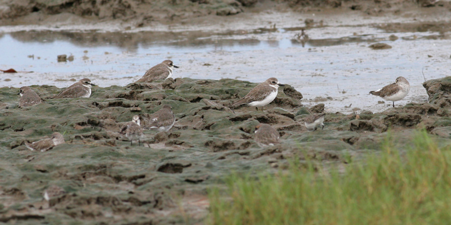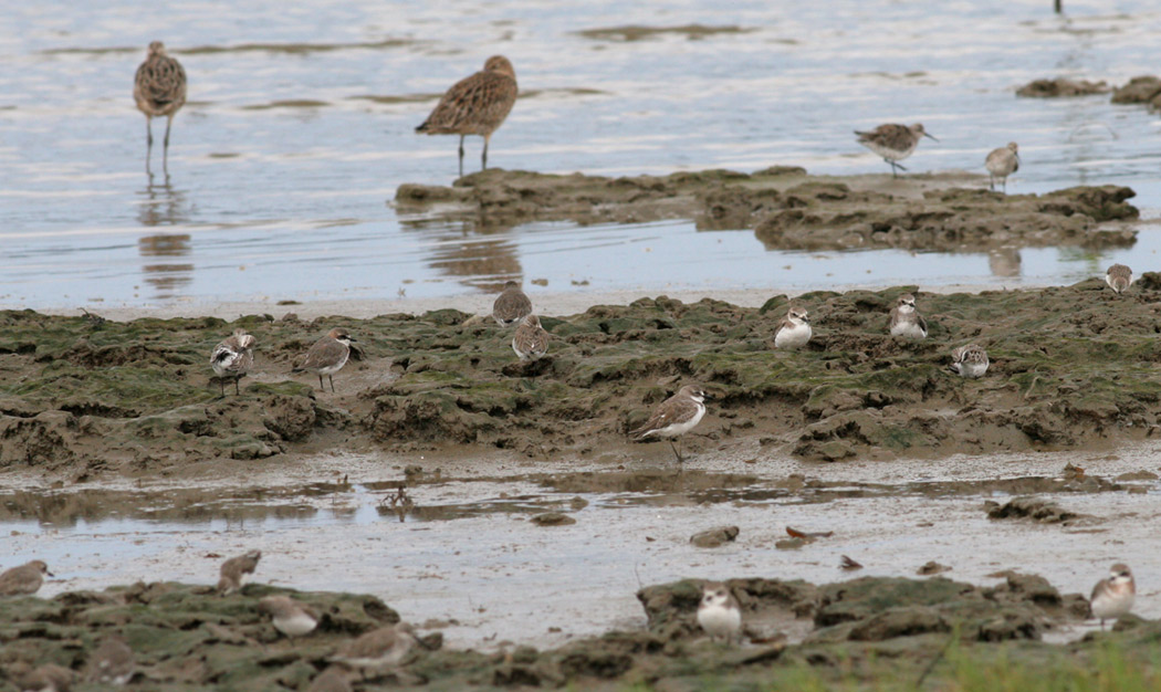 Derudover ses på billedet seks Krumnæbbede og tre Rødhalsede Ryler samt to Far Eastern Curlews.
