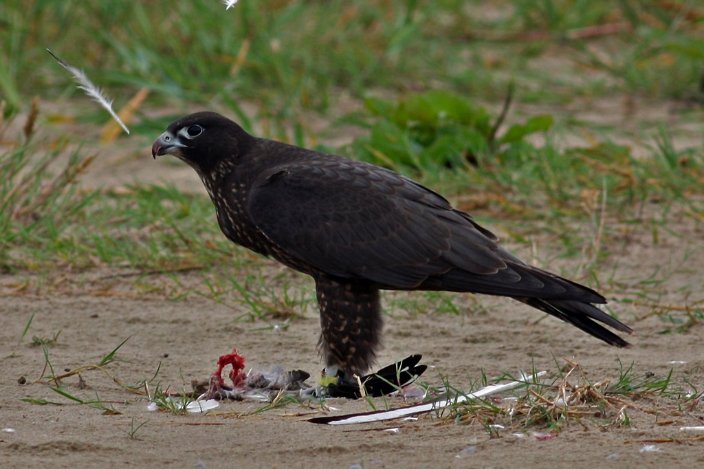 Den er meget mørk, mørke dækfjer og lidt lysere svingfjer.