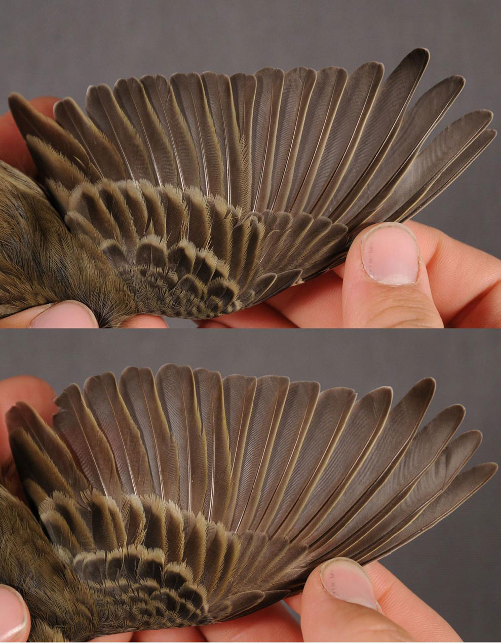 Sammenlign ungfuglens hånd, armsvingfjer og alula med den adulte fugl. Se også forskellen i hånddäkfjer, hvor den adulte fugl er bredere end ungfuglen og har en mörkere nuance.