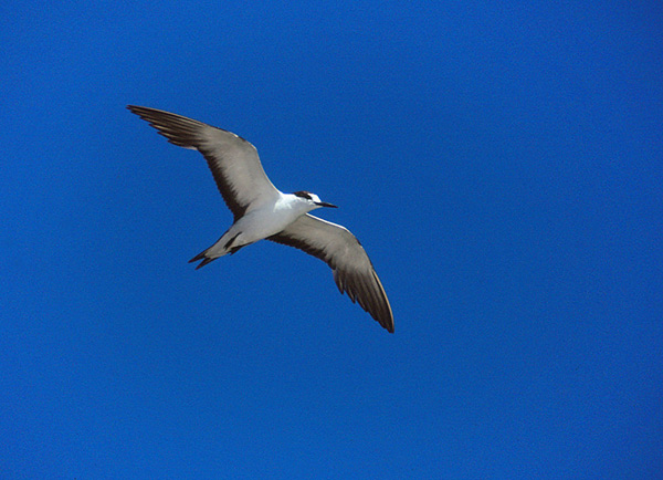 Beskrivelse: Adult. Compared to Bridled Tern, the Sooty has broader and more blackish trailing edge to secondaries, and darker primaries. Note the moulting in the inner primaries. The Sooty Tern has a 10-months (not 12-months) breeding-cyclus - at least in the Seychelles. I don´t know if the shorter breeding-cyclus affects the birds moulting-cyclus as well.