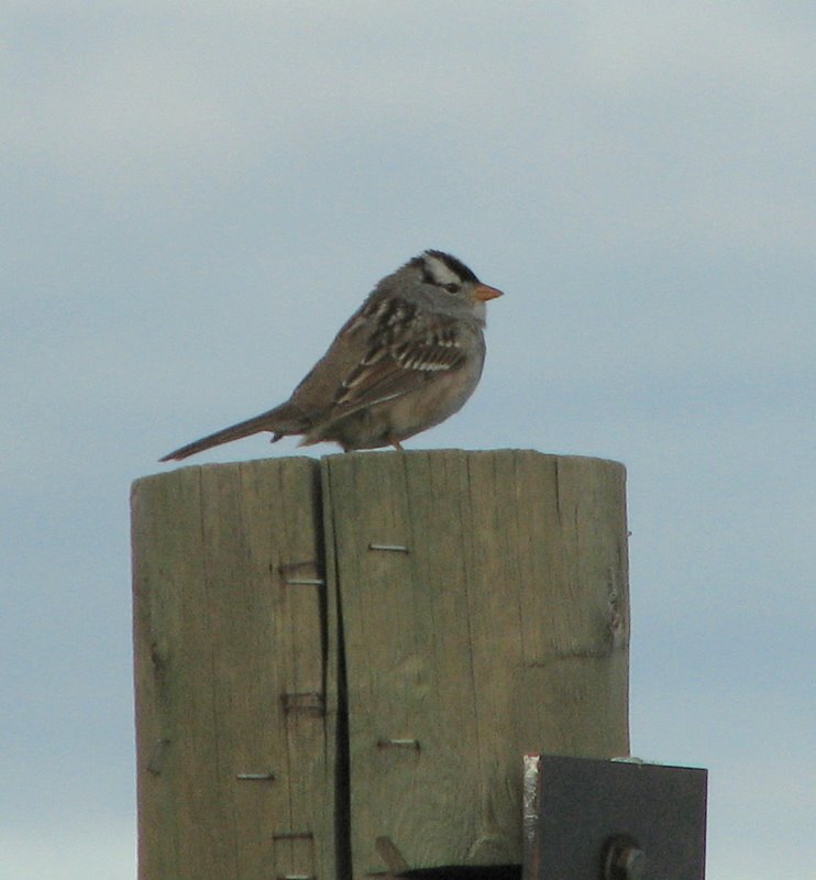 Beskrivelse: Formodentlig den nordlige race Z. l. gambelii pga hvid øjenbrynsstribe foran øjet og orangepink næbfave.