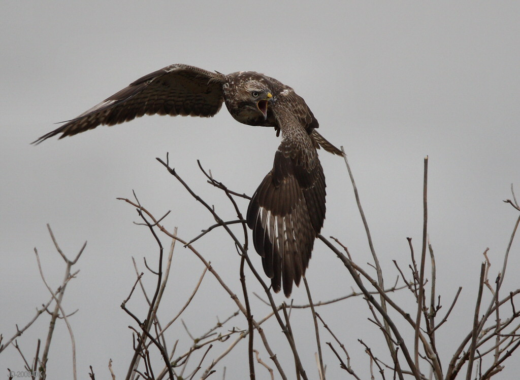 Beskrivelse: En irriterende fjeldvåge i nærheden udløser en række skrig fra denne musvåge.