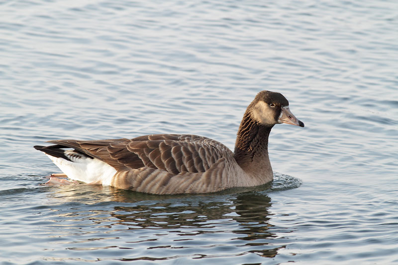 Beskrivelse: Dette er den ene af to hybridgæs, der svømmede rundt i Nykøbing havn i nogle timer over middag. De var i lange tider uden for fotoafstand og mod solen, men til sidst lykkedes det. De lå og kaldte med en dyb stemme a la canadagås. Er der nogen, der har et bud på forældrene.