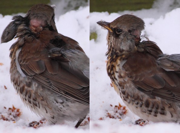 Beskrivelse: Bemærk hvordan skaderne i fjerdragten viser at Spurvehøgen (?) har haft godt fat med kløerne i ryggen af byttet, mens den har plukket og derpå hakket i byttets nakkemuskler for at gøre det af med byttet. Men åbenbart er byttet undsluppet i sidste øjeblik. Hændelsen må være sket for nogen tid siden (uger?), idet såret ikke længere er blodigt eller væskende og har fremvækst at granulationsvæv fra sårbunden.