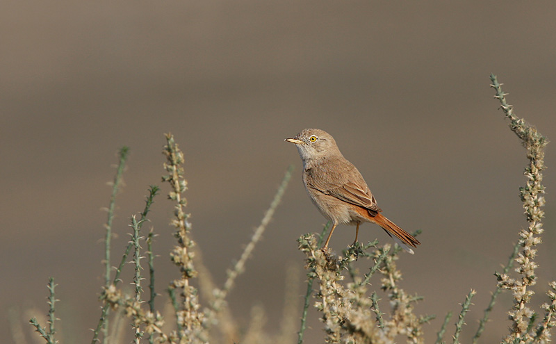 Beskrivelse: A fantastic bird which was encountered at a number of localities during our cruise through northern Oman. An interesting observation we made was that quite often desert wheaters were stalked by desert warblers! It seems quite common for these two species to be living in some sort of symbiosis at the winter quarters on the Arabian Peninsula. If you spot a desert wheatear in shrubby habitat in Oman, always make sure to thoroughly scan the ground around the wheatear for desert warbler!