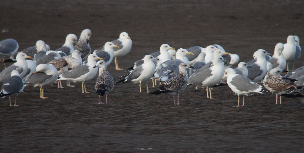 Beskrivelse: Caspian Gull of the form <i>barabensis</i> is the most numerous of Oman's wintering large gulls. Lesser Black-backed Gull of the ssp. <i>heuglini</i>, "Heuglin's Gull", is the second most common. The 1st c.y. individual facing to the right is probably a Heuglin's due to the overall fresher plumage compared to the more worn 1st c.y. Steppe Gulls.