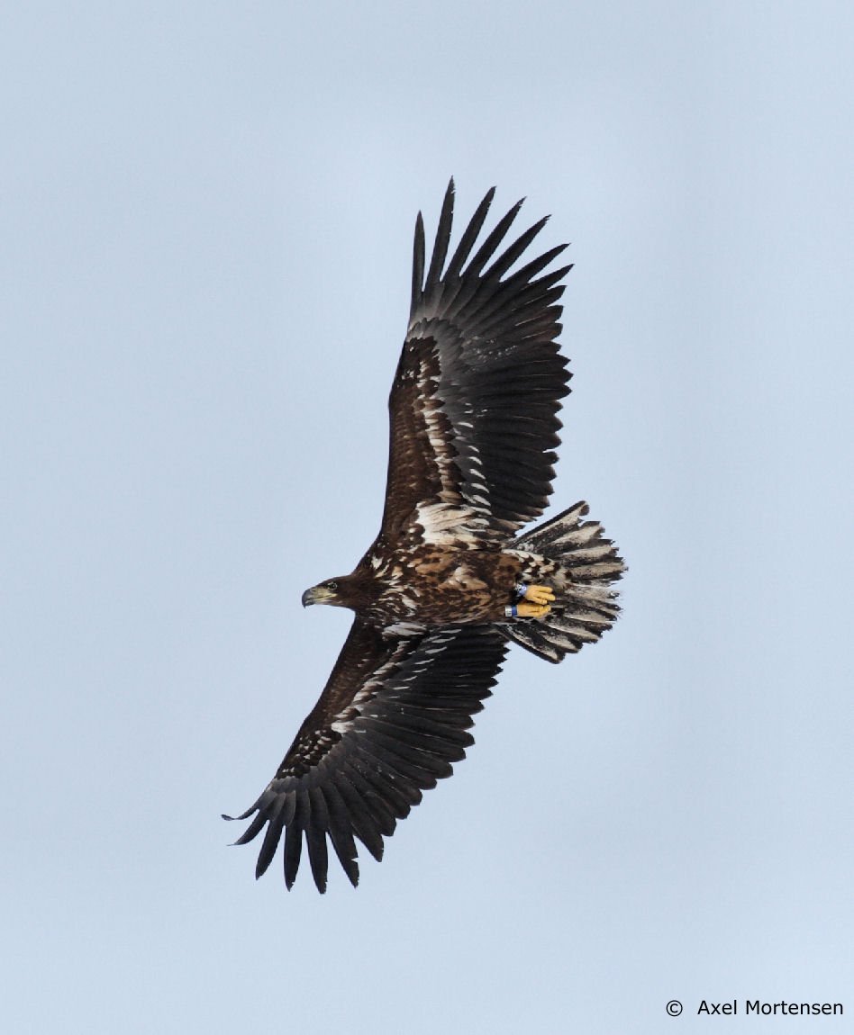 Iflg. den nys udkomne bog "Havørnens Danmark" markerer højre fods ringe landekoden, mens sammensætningen af venstre fods ringe er årstalskoden. Hvid/blå farveringe på denne ørns højre viser, at den stammer fra svensk ferskvand, og det vil nok sige Skåne. Sort/blå (som jeg ser det) viser at den er klækket i 2009, altså en 2k fugl nu, hvilket vel dragtmæssigt heller ikke er overraskende.