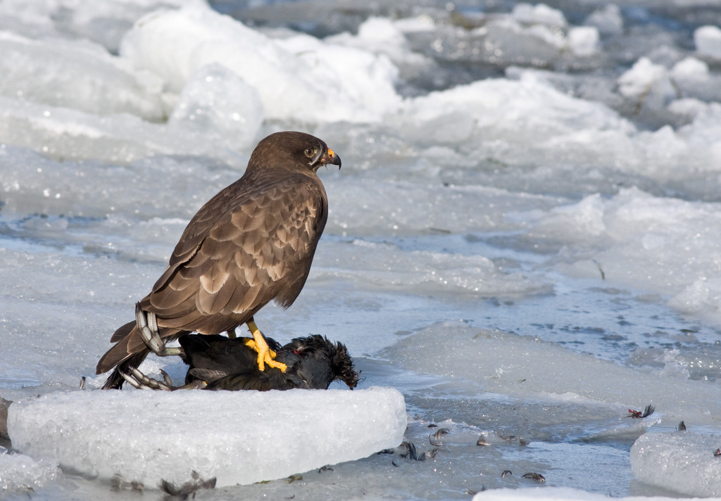 Beskrivelse: Musvågen fandt en halshukket blishøne på isen i havnen.