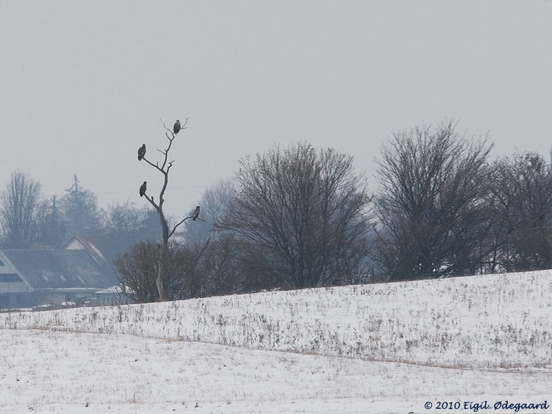 Beskrivelse: Som østdansker er vi vant til et syn som dette fra Skåne, men det bliver mere og mere almindeligt også i danmark at se noget tilsvarende som her 1 ad + 3 juv med endnu en ad i nærheden der holder øje med fugle i vanskeligheder på isen. Op til 8-10 ørne er der såvidt jeg ved meldt i denne vinter i denne ende af Roskilde fjord samtidigt.