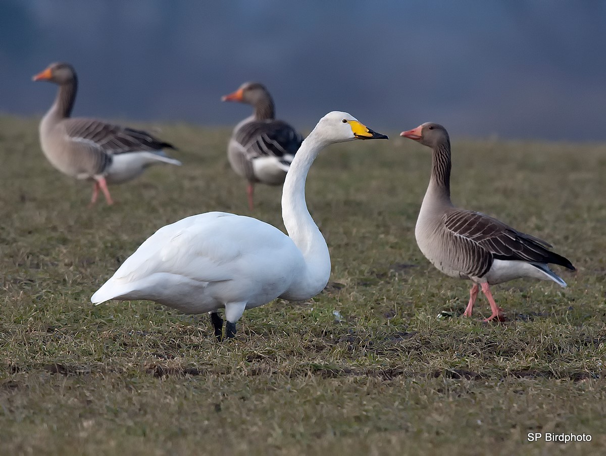 Beskrivelse: Grågæs/Sangsvaneflok på græsmark NV for Hillerød. Svanerne er svinet godt til i mangel på isfri søer.