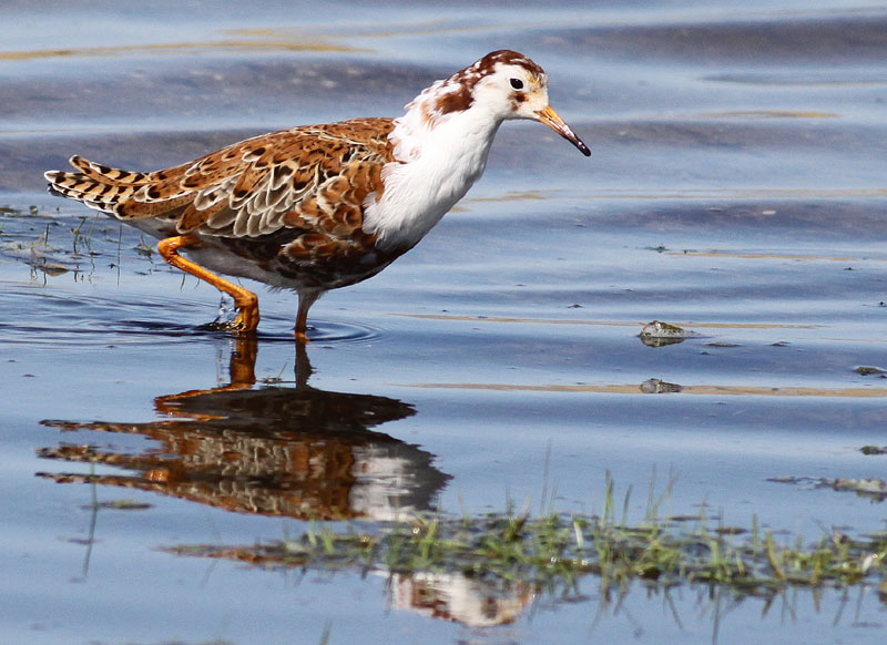 Når den efter midsommer fældes igen volder Brushanerne tit problemer. Her ses fint den "løse" fjerdragt, der forstørrer den i forvejen uproportioneret store krop, og én af de vigtige karakterer: de lange, tværbåndede tertiærer, der selv ved slag rygvind hvirvler op og danner en karakteristisk "skihop-bane" bagtil, der tit er udslagsgivende på afstand.