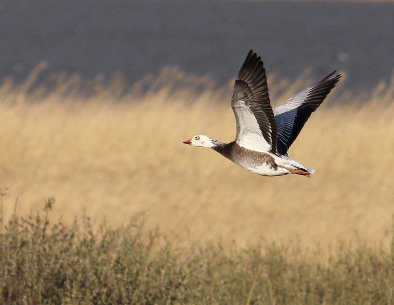 Beskrivelse: Først taget som "formodet hybrid Grågås X Indisk Gås." Fuglen var ca. 9/10 af omkringstående Grågås i størrelse, og havde orange indslag på næbbet, som det ses hos Indisk Gås. Også de meget lysegrå indslag er i linie med Indisk Gås. Kommentarer fra Knud Flensted og David Boertmann antyder blå fase Snegås