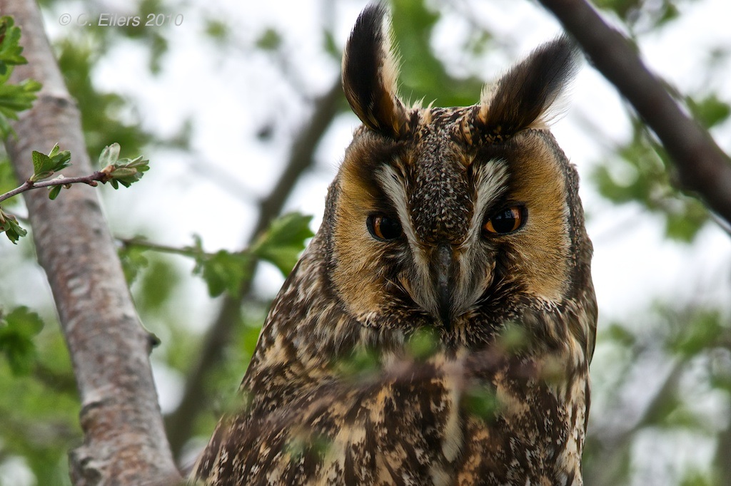 Beskrivelse: Uglen satte sig tilrette på en gren i "foto"højde. Godt nok var der små grene hele vejen rundt men pyt. Den var der og det er en flot fugl.