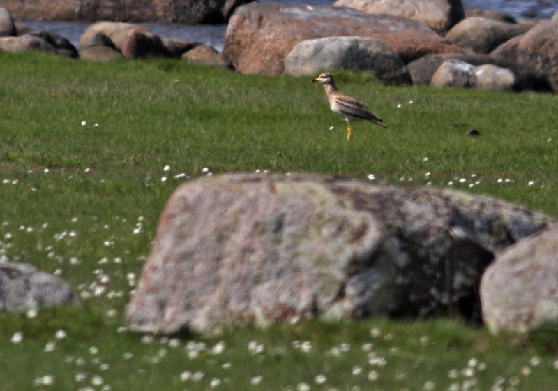Min FO/DOF-aftenskole var på privattur til Øland og skulle finde en høgesanger ved Södre Lunden men vi gik forkert og endte ude på engene - Hanne Witthøft kigger som sædvanlig grundigt i sit teleskop og ved den første fugl siger hun: Det er en Triel! - uden omsvøb - jeg kigger i scopet og ser hovedet af fuglen i varmeflimmeret og ser også en Triel - men bevarer fatningen - jeg har før dippet - fuglen viser sig i hel figur og det er sgu en Triel. Da gruppen har set fuglen løber jeg op til vejen og fægter med armene og får stoppet en svensker med C3 BMS alarm - og 10 min efter står der 200 svenskere og ser fuglen.