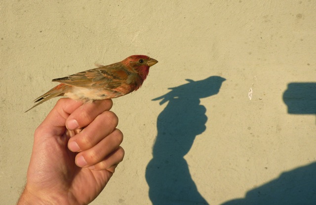 Mærket af JoG d. 4. juni 2008 som 2K+, vingelængde 84. Fuglen yngler i "posthaven", og var den første Karmindompap i Blåvand i 2010 (aflæst af TLP).