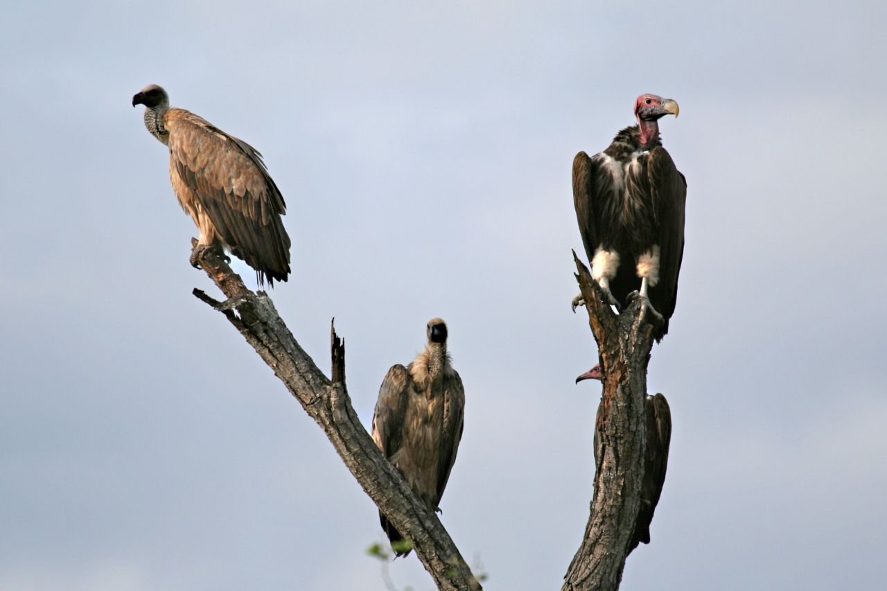 Beskrivelse: Øregrib, hvidrygget grib og hættegrib (delvis skjult).