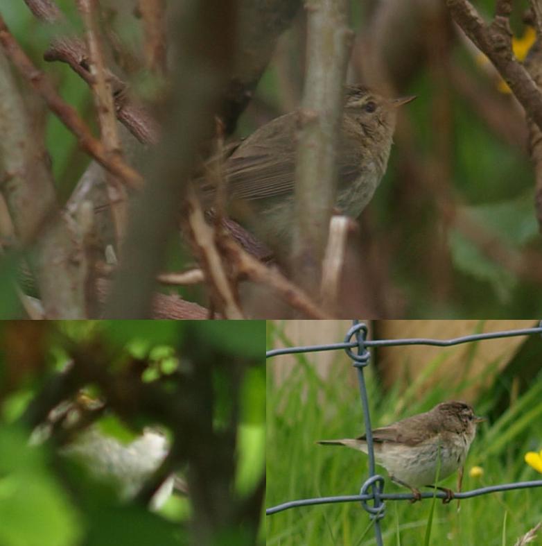 Beskrivelse: Jeg fandt denne phyl i et ret åbent krat, hvor jeg havde den ganske kort. Den virkede storhovedet og specielt øjenbrynstriben fik mig til at tænke pi retning af lundsanger. Desuden så den ud til at have såkaldt opstoppernæb og undernæbbet virkede ensfarvet orangegult. Desuden virkede næbbet kraftigt. Dog så jeg ikke noget vingebånd og fuglen kaldte ikke. Generelt var fuglen i en pjusket forfatning. Den har jo nok lige krydset havet mellem fastlandet og Færøerne. I godt lys så brystet temmelig ensfarvet lyst ud (foto nederst tv). Jeg er lidt på bar bund, idet det jo godt blot kan være en afvigende og pjusket gransanger eller løvsanger, men den virkede bare ikke særlig grans eller løvs-agtig. Det skal dog siges, at fuglen var meget sky og jeg fik aldrig set den rigtig godt. Jeg gik først og fremmest efter at få fotos.