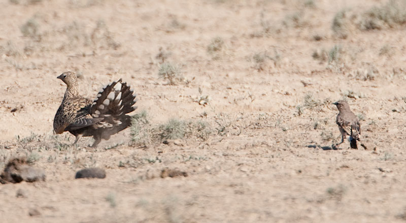 Beskrivelse: Hun af sortbuget sandhøne viser trueadfærd over for isabellastenpikker. Med de udspilede halefjer kommer bagenden til at ligne "dødes gab" med store hvide tænder.