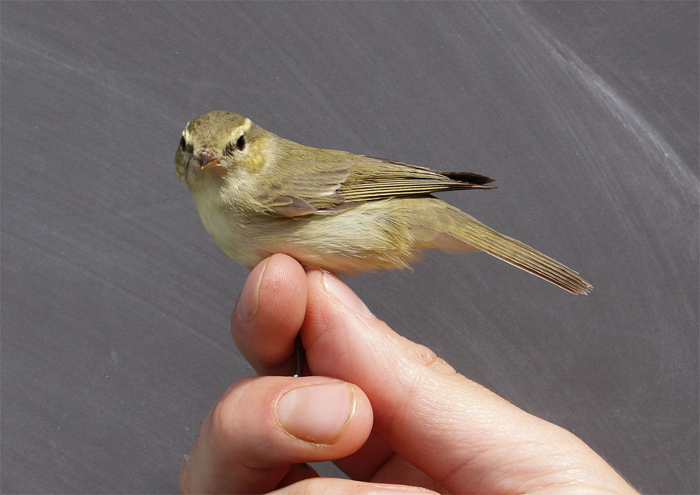 Beskrivelse: I dag d. 17-07-10 kl. 10.30 blev denne Phylloscopus sp 2k+ fanget ved Blåvand Fuglestation af Michael Johansen og Henrik Knudsen.