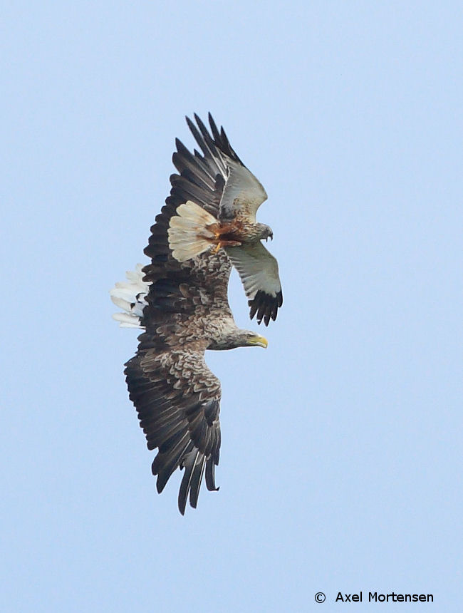 Beskrivelse: Da havørnen kom ind med en fisk fra Arresø, angreb en rørhøg den pludseligt og fulgte den over en lang strækning.