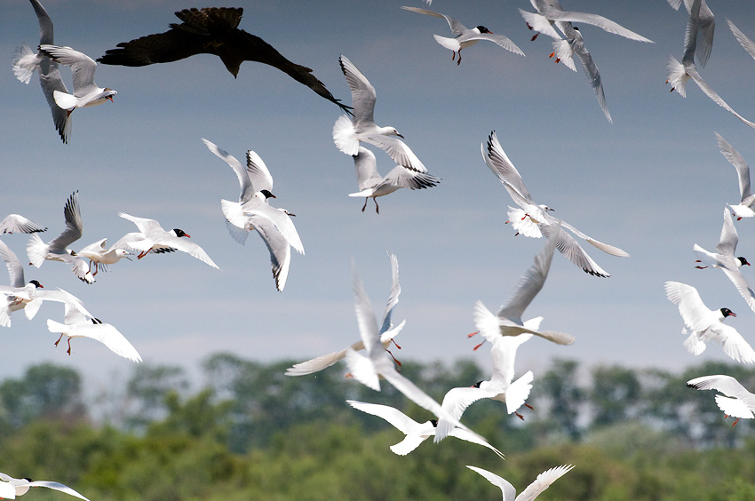 Beskrivelse: En Sort Glente kom for tæt på en af mågeøerne. Endvidere ses Sorthovedet Måge.