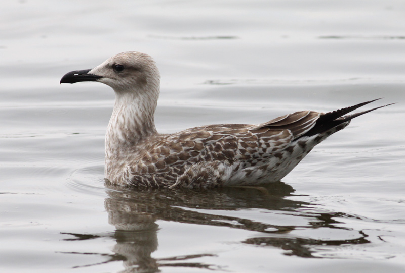 Beskrivelse: 1K Middelhavssølvmåge. Bemærk slank form,mellembrunt helhedsindtryk, lang vinge bag halespidsen samt tertiærernes mønster: mørke med smalle lyse rande begrænset til yderdelen. I flugten sås næsten sildemågeagtigt mørke vinger, incl. undervinger, samt bredt sort halebånd mod hvid halerod. Fuglen har skiftet enkelte rygfjer, hvor Sølv- og Sildemåge fortsat ville være i ren juvenil dragt ult. juli.