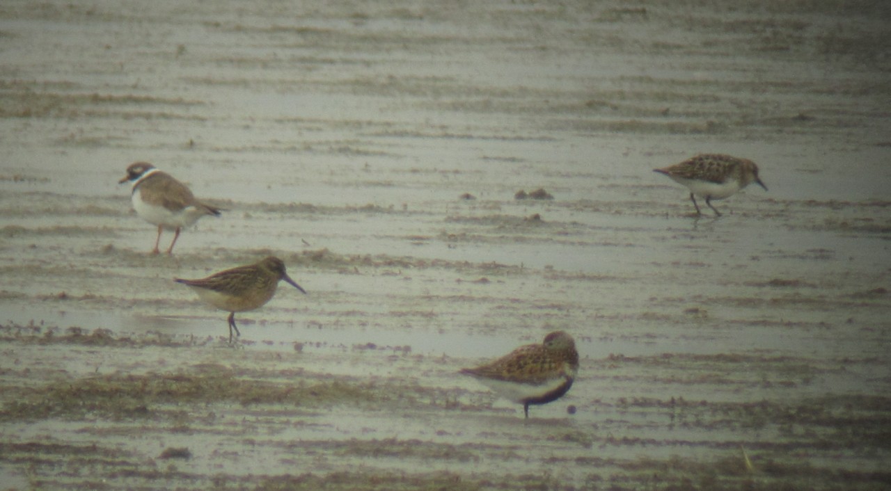 Artsbestemmelse vil jeg ikke gøre mig klog på, men en ting jeg slet ikke kan få til at passe på dette billede er størrelsen. Fuglen bagest til højre burde i min optik være væsentlig mindre end de to forreste, som såvidt jeg kan se er en ung krumnæbbet ryle og en almindelig adult. Den forekommer mig alt for stor !??
