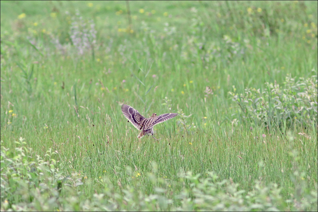 Beskrivelse: Fuglen blev trådt op på engene ved Farmen, Fanø. Den var meget eksemplarisk, og opførte sig som foreskrevet: lettede på 5 til max.10 m afstand (længe efter en del dobb.bek) og med lavt bulrende vingeslag som en agerhøne (altså ikke så kraftigt!), fløj lige og lavt, og landede kort efter, hvor den kunne genfindes og proceduren gentages nogle gange. Gav flere gange kort, dybt, lavmælt brokkende kald. Det var fan... svært at få foto af de hvide halesider, idet spredt hale kun sås i de første sekunder ved opflyvning hvor det var umuligt (både manuel og autofukus) at nå at stille skarpt pga. den korte afstand, og igen kortvarigt ved landing- men her så sent, at den var skjult af vegetation.