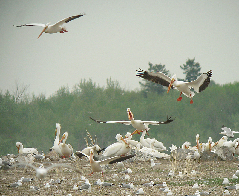 Beskrivelse: Koloni med krans af Canadamåger omkring.