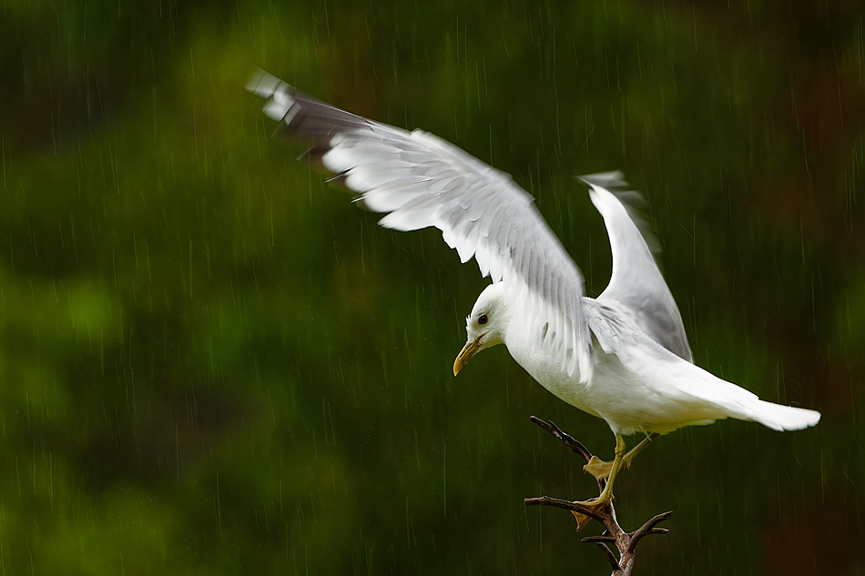 Ikke alene har du foreviget en ikke så almindelig situation med en måge i et træ, men du har vist den mod en smuk baggrund, og gennemtænkt billedet fototeknisk for at drage fordel af regnvejret!