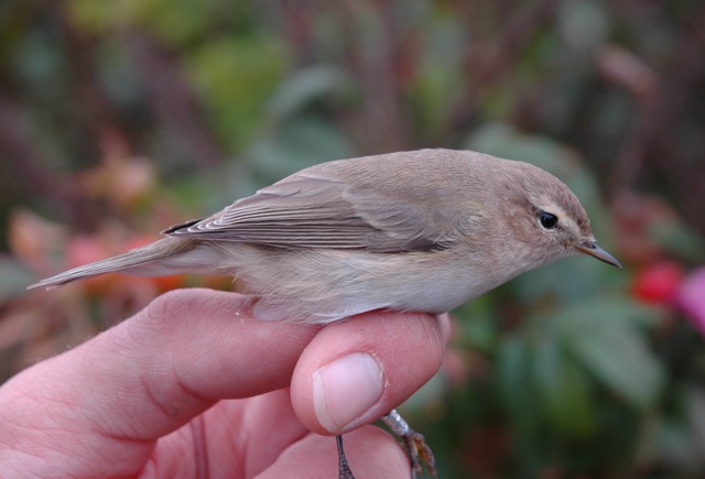 Da jeg mærkede den første tristis forleden begik vi den fejl, kun at tage billeder foran den grå mur, hvorfor især rygfarven blev overdrevet grønlig. Derfor udtrykte enkelte læsere af Blåvandsbloggen let skepsis, hvilket er forståeligt nok ud fra billederne. I hånden og i felten oplevedes den dog klart andeledes end alle andre Gransangere, jeg har set, ligesom kaldet ikke var et stigende Gransangerkald, men et fladt piiiv.