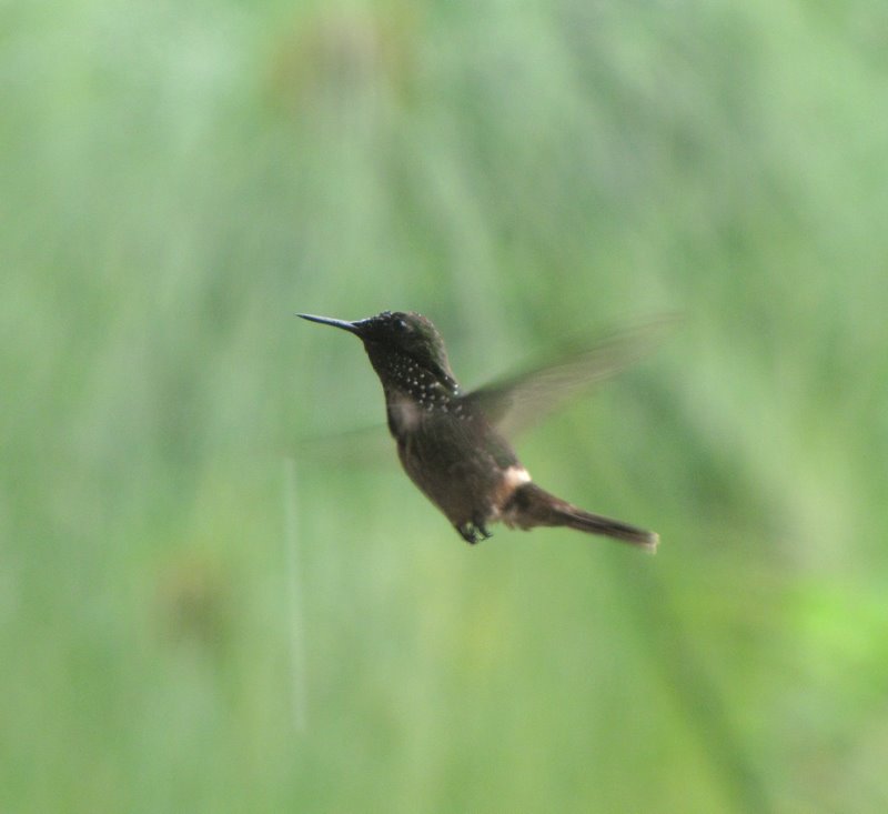 Beskrivelse: Brugte nogen timer på en regnvejrsdag med at sidde under halvtaget på fazenda'en og hygge med 30-40 kolibrier omkring sukkervandsautomaterne, og prøvede også lykken med lidt foto. På trods af (eller på grund af) det ringe lys kom der nogen lidt alternative kolibri-billeder ud af seancen.