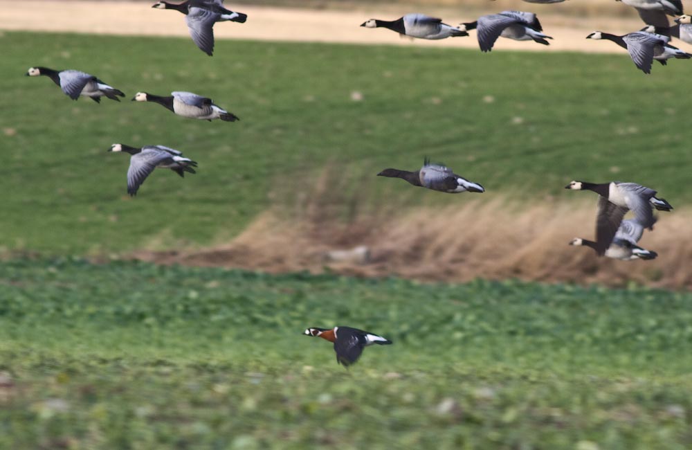 Titel: Rødhalset gås sammen med knortegås og bramgæs
