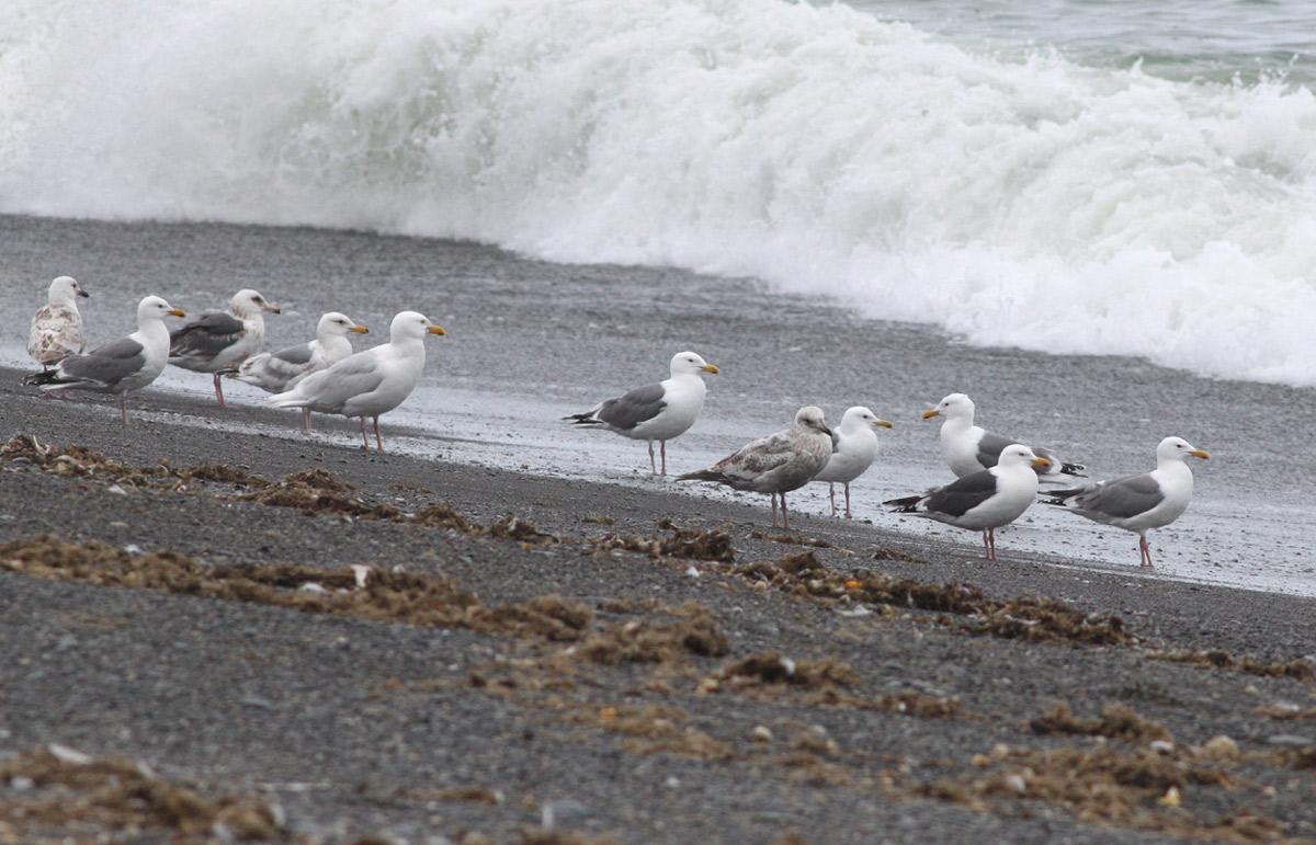 Beskrivelse: A group of gulls at Meinypilgyno, southeastern part of Chukotka. From left to right: 2nd c.y. vegae/shistisagus, ad vegae, 3rd c.y. vegae/shistisagus, 3rd c.y. vegae, ad hyperboreus, ad vegae, 2nd c.y. vegae/shistisagus, ad vegae/shistisagus, ad vegae/shistisagus x 2 and ad vegae. At Meinypilgyno, predominantly vegae were seen but also several shistisagus and several intermediates. Interestingly, up north in Anadyr, the gull-population obviously consisted of pure vegae. In the southeast of Chukotka, shistisagus represented appr at least 1/3 of the gulls seen. At Beringovskiy in between (close to Mys Navarin), not a single vegae were seen! Comments on this would be very appreciated!