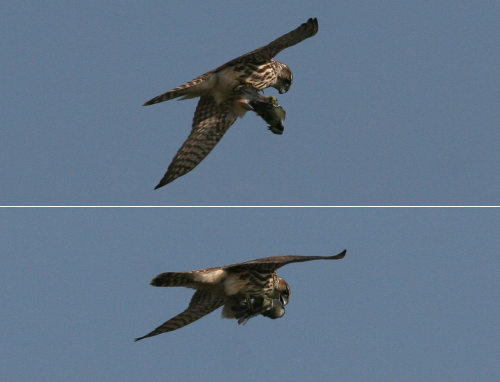 Beskrivelse: Whitnessed a fantastic aerial display when this juv Merlin caught a Blue Tit straight above our heads, and subsequently started to feed on it.
