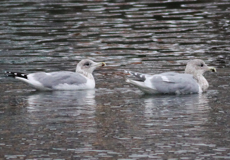 Beskrivelse: Det er Gråvinget måge til højre - men bemærk denne look-alike Sølvmåge med lignende næbtegning, hovedtegning der også ligner den gråvingede måges noget, samt mørkt øje. De væsentligste forskelle er Sølvmågens sorte farve på de kortere håndsvingfjer, samt den lidt slankere form.