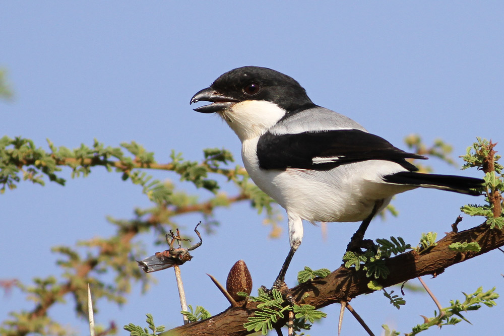 Beskrivelse: Bemærk græshoppen som fuglen netop har spiddet på en torn!