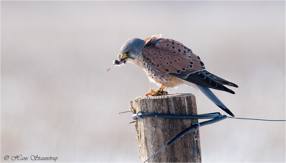 Beskrivelse: Efter en par hårde vintre hvor det er gået hårdt ud over Tårnfalken,er det en ekstra stor fornøjelse at støde på den derude.På svirrende vinger står den,for derefter at styrtdykke efter en mus i græsset.