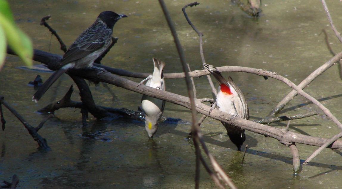 Beskrivelse: Gulstrubet Stenspurv -sammen med et par Rødgumpet Bulbuls - (Pycnonotus cafer) - Red-vented Bulbuls.