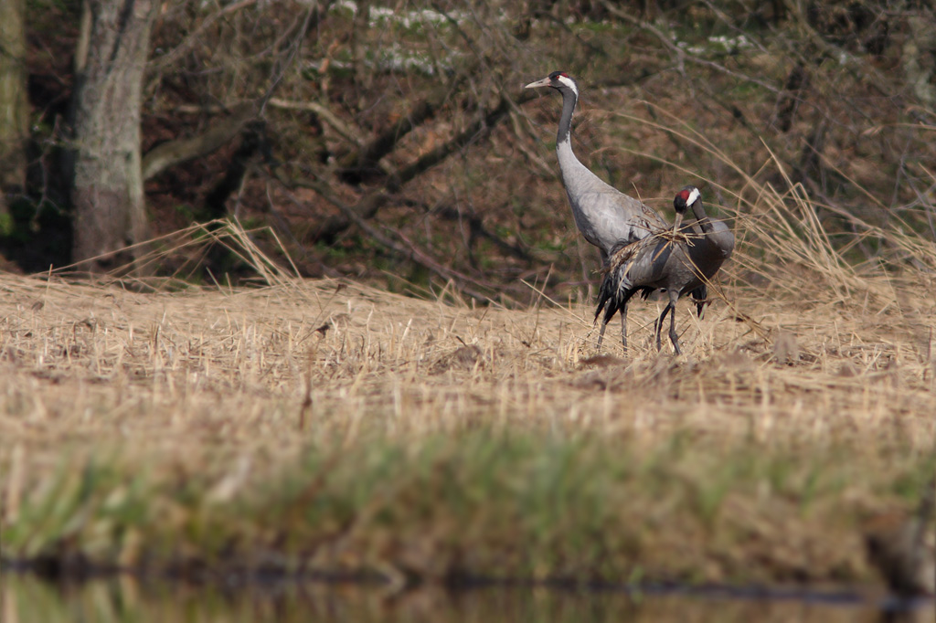Beskrivelse: Tranerne skiftedes til at kaste med tagrørene afbrudt af høje trompeterlyde, der gjaldede ud mellem klipperne.