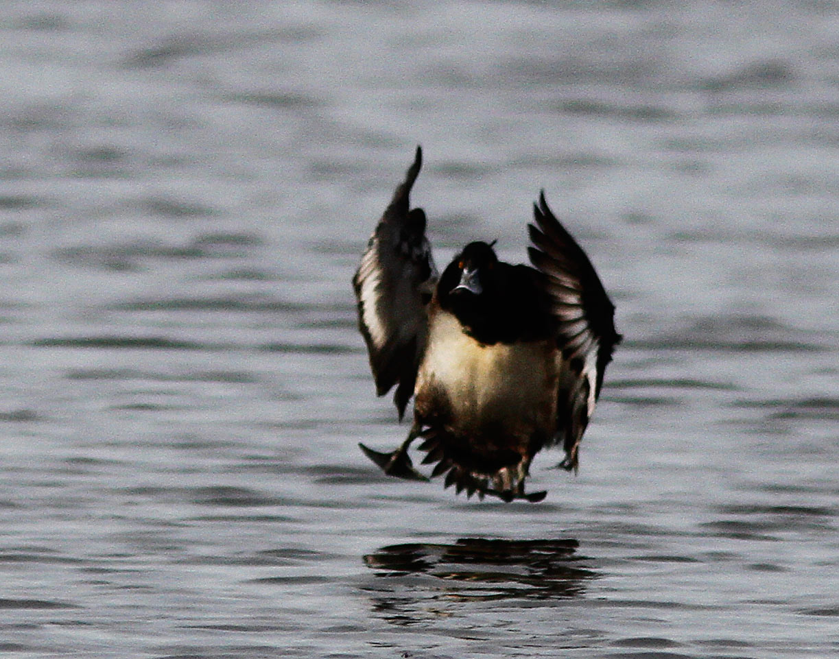 På dette foto ses igen de tegninger på næbbet der fik mig til at reagere, hvilket også ses på de andre fotos. Her ses dog at fuglen tilsyneladende har en lang top i nakken, samt et tydeligt hvidligt vingebånd, dette passer ikke på en ren Halsbåndstroldand, men kan passe på en hybrid.
