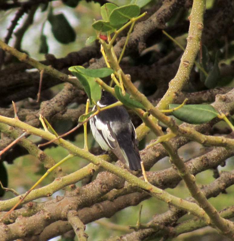 Denne Balkanfluesnapper var den eneste som holdt sig bare nogenlunde i ro, men sad ofte halvgemt. Det lyse vingebånd på de mellemste dækfjer og hvidsmudsige overgump ses her.