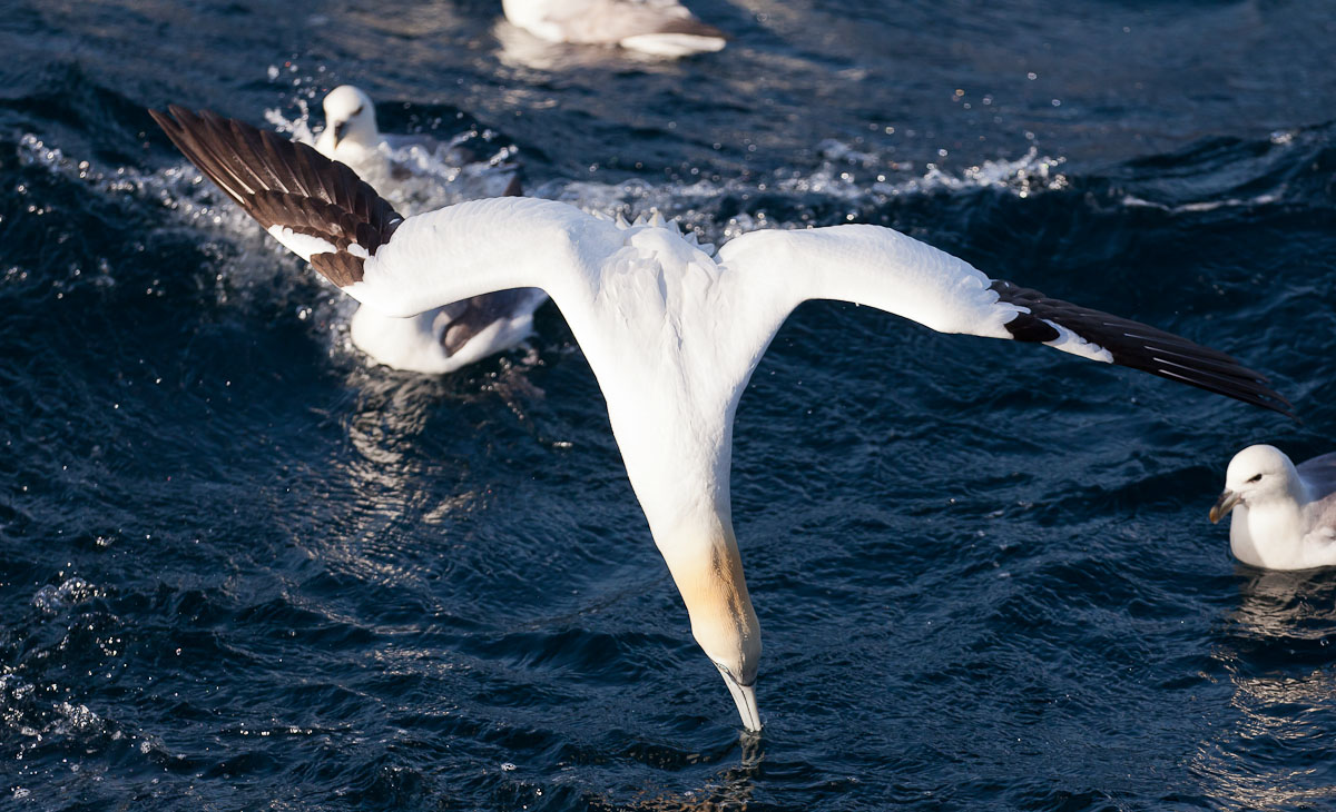 Beskrivelse: Taget under fiskeri i nordsøen, vi har ofte flokke af suler ved skibet mens vi hiver garnene, og af og til er vi heldige at de dykker en del, men der er dog yderst sjældent at det lykkes at fange dem så godt som her hvor næbet lige har brudt vandet på vej i et dyk.