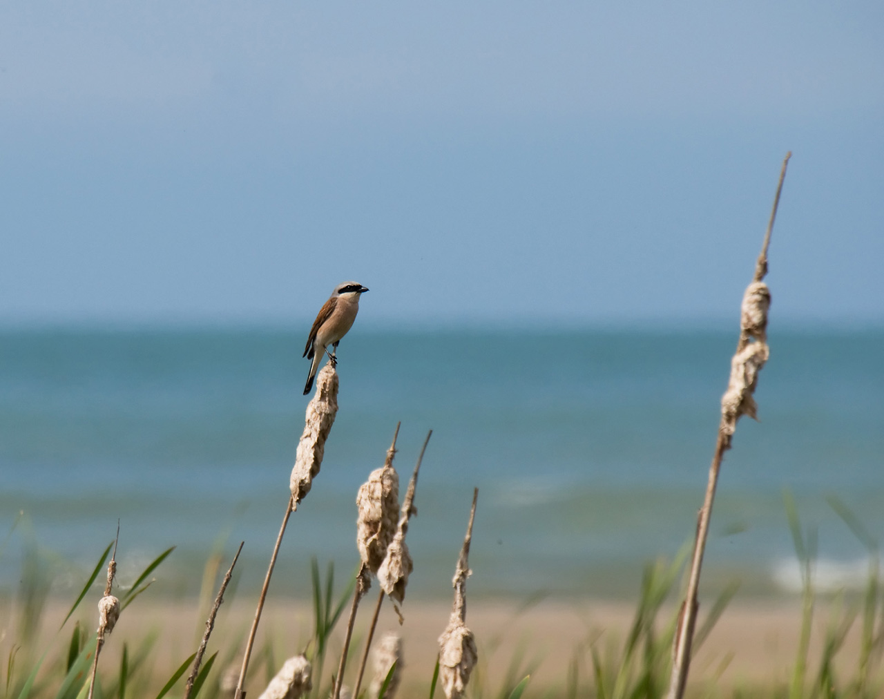Dejligt billede hvor den Rødrygget Tornskade sidder ude i Strandsumpen, og med havet som baggrund.