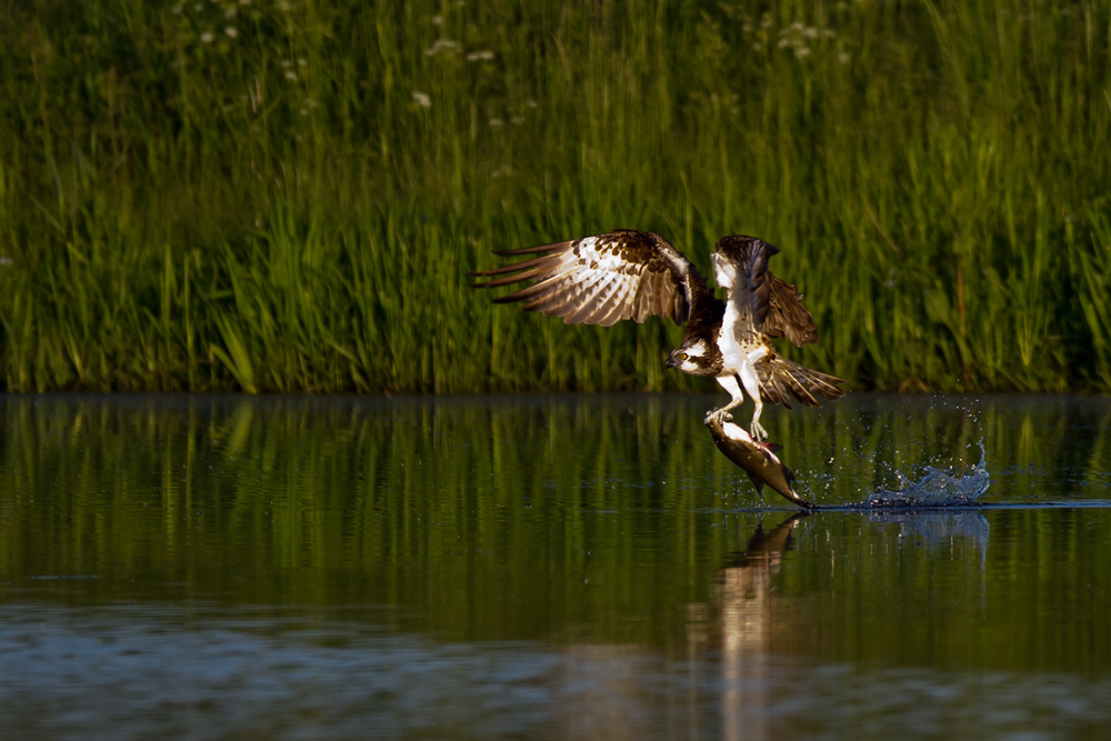 Beskrivelse: To oversomrende fiskeørne i stærk fældning tager for sig af retterne i det flade søvand. Denne ( brasen tror jeg det er ), var svær at få fri af vandet.